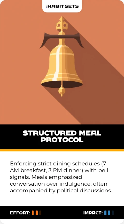 Enforcing strict dining schedules (7 AM breakfast, 3 PM dinner) with bell signals. Meals emphasized conversation over indulgence, often accompanied by political discussions.