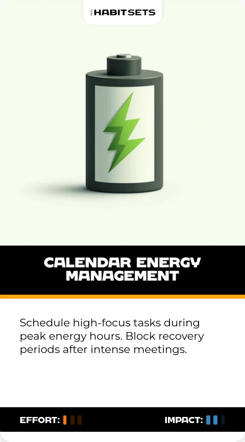 Schedule high-focus tasks during peak energy hours. Block recovery periods after intense meetings.