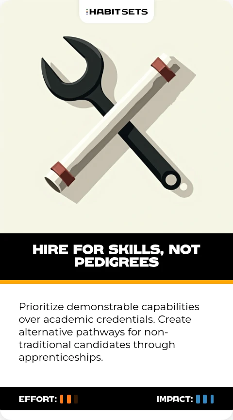 Prioritize demonstrable capabilities over academic credentials. Create alternative pathways for non-traditional candidates through apprenticeships.