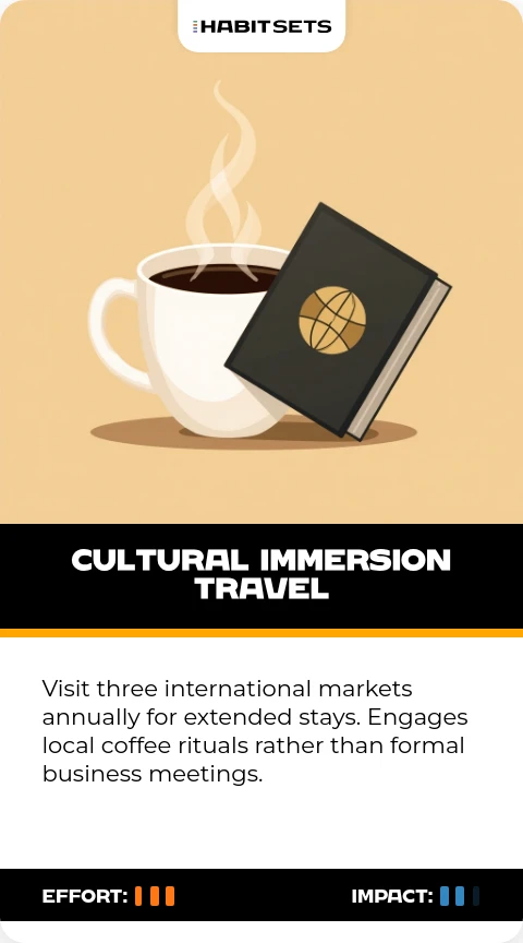Visit three international markets annually for extended stays. Engages local coffee rituals rather than formal business meetings.