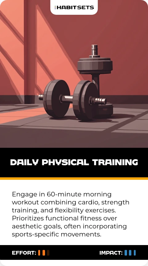 Engage in 60-minute morning workout combining cardio, strength training, and flexibility exercises. Prioritizes functional fitness over aesthetic goals, often incorporating sports-specific movements.