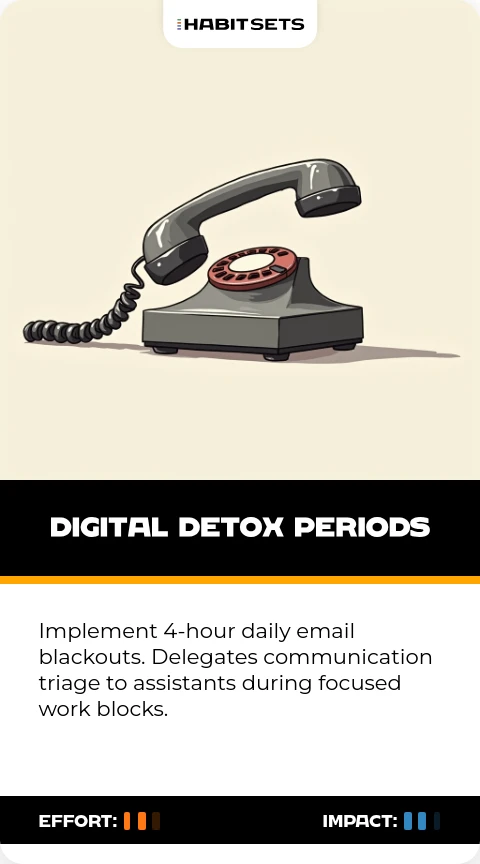 Implement 4-hour daily email blackouts. Delegates communication triage to assistants during focused work blocks.