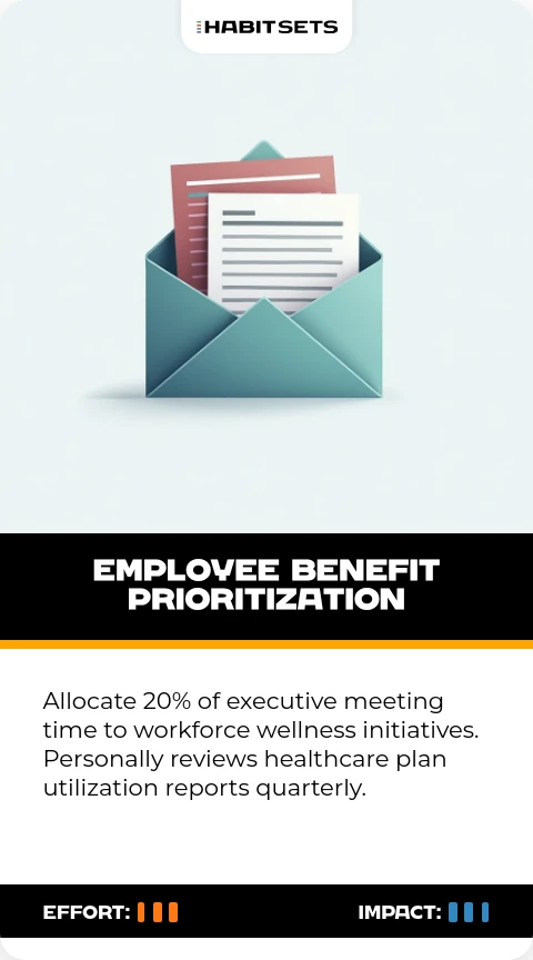 Allocate 20% of executive meeting time to workforce wellness initiatives. Personally reviews healthcare plan utilization reports quarterly.