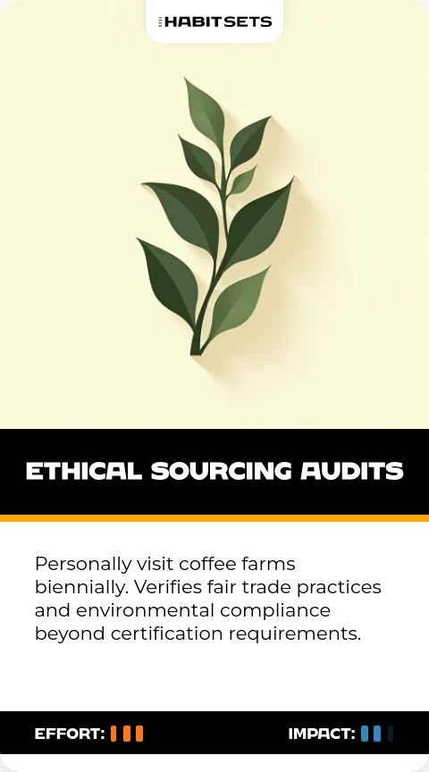Personally visit coffee farms biennially. Verifies fair trade practices and environmental compliance beyond certification requirements.