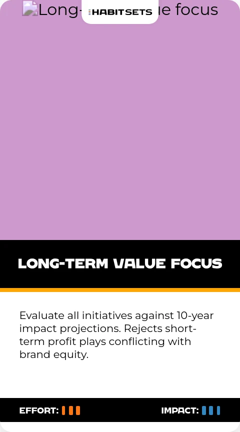 Evaluate all initiatives against 10-year impact projections. Rejects short-term profit plays conflicting with brand equity.