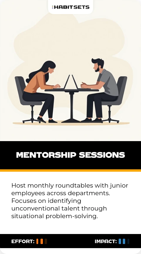 Host monthly roundtables with junior employees across departments. Focuses on identifying unconventional talent through situational problem-solving.