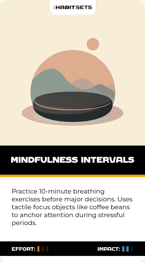 Practice 10-minute breathing exercises before major decisions. Uses tactile focus objects like coffee beans to anchor attention during stressful periods.