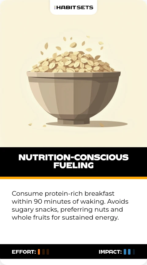 Consume protein-rich breakfast within 90 minutes of waking. Avoids sugary snacks, preferring nuts and whole fruits for sustained energy.