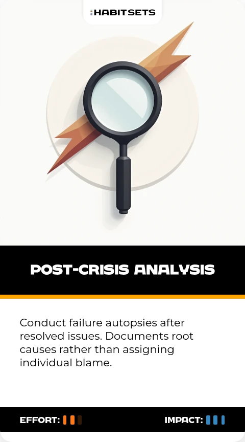Conduct failure autopsies after resolved issues. Documents root causes rather than assigning individual blame.