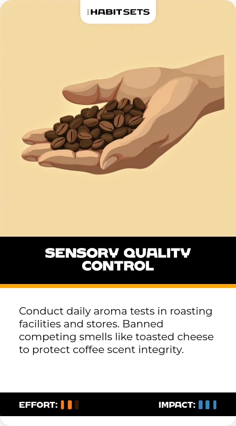 Conduct daily aroma tests in roasting facilities and stores. Banned competing smells like toasted cheese to protect coffee scent integrity.