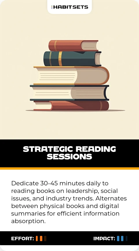 Dedicate 30-45 minutes daily to reading books on leadership, social issues, and industry trends. Alternates between physical books and digital summaries for efficient information absorption.
