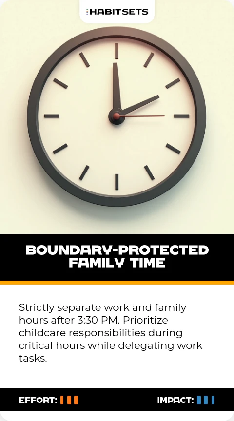 Strictly separate work and family hours after 3:30 PM. Prioritize childcare responsibilities during critical hours while delegating work tasks.