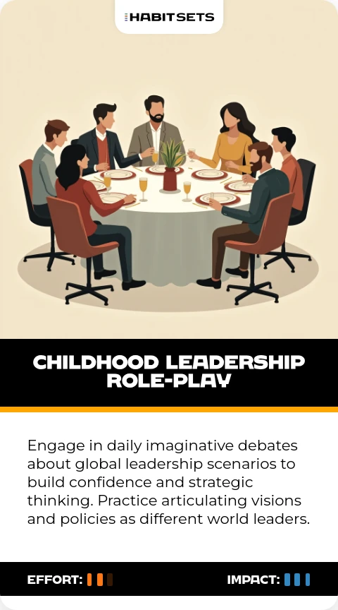 Engage in daily imaginative debates about global leadership scenarios to build confidence and strategic thinking. Practice articulating visions and policies as different world leaders.