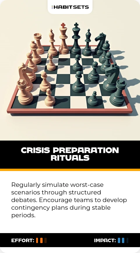 Regularly simulate worst-case scenarios through structured debates. Encourage teams to develop contingency plans during stable periods.