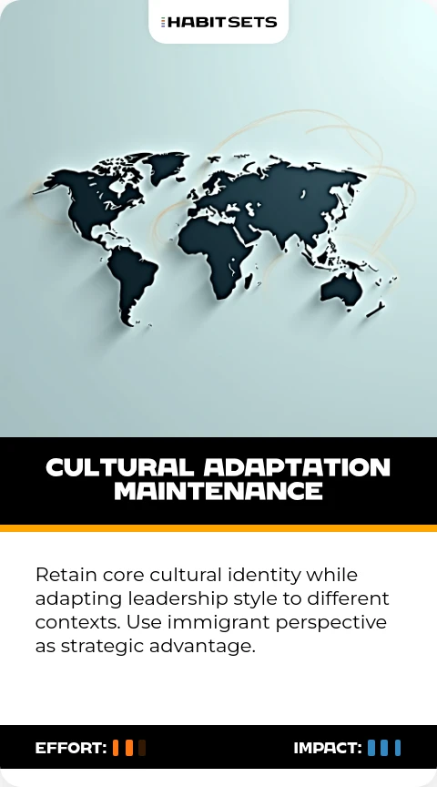 Retain core cultural identity while adapting leadership style to different contexts. Use immigrant perspective as strategic advantage.