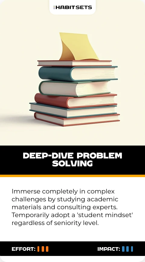 Immerse completely in complex challenges by studying academic materials and consulting experts. Temporarily adopt a 'student mindset' regardless of seniority level.