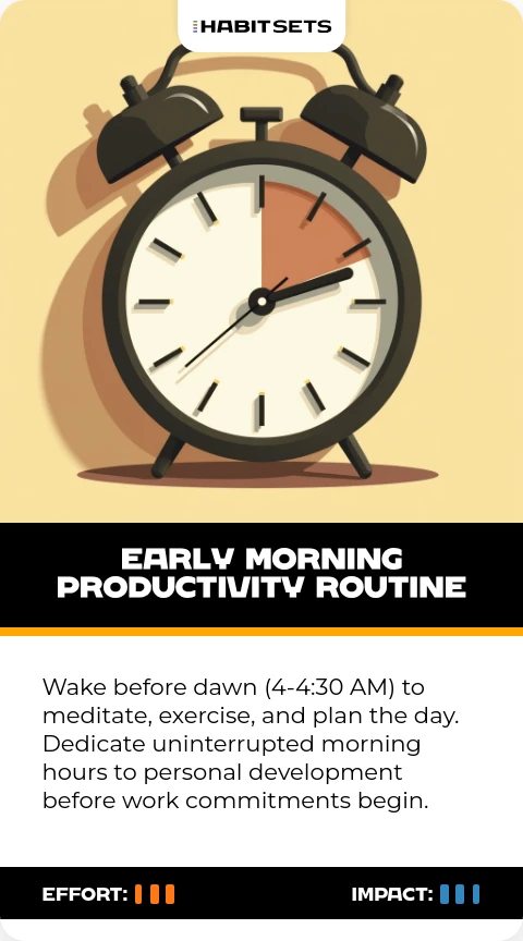 Wake before dawn (4-4:30 AM) to meditate, exercise, and plan the day. Dedicate uninterrupted morning hours to personal development before work commitments begin.