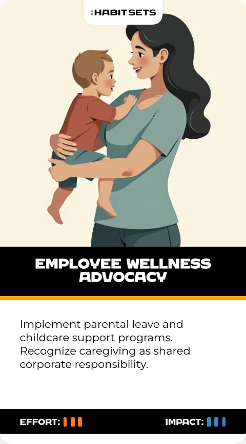 Implement parental leave and childcare support programs. Recognize caregiving as shared corporate responsibility.