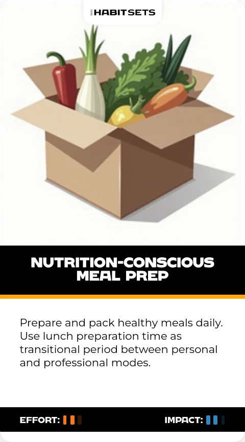 Prepare and pack healthy meals daily. Use lunch preparation time as transitional period between personal and professional modes.