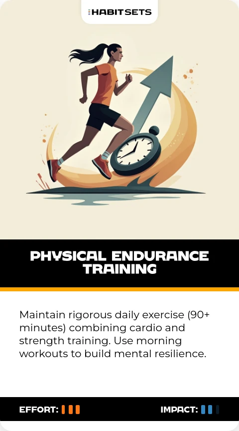 Maintain rigorous daily exercise (90+ minutes) combining cardio and strength training. Use morning workouts to build mental resilience.
