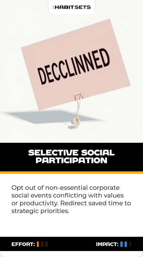 Opt out of non-essential corporate social events conflicting with values or productivity. Redirect saved time to strategic priorities.