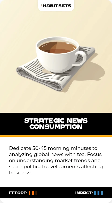 Dedicate 30-45 morning minutes to analyzing global news with tea. Focus on understanding market trends and socio-political developments affecting business.