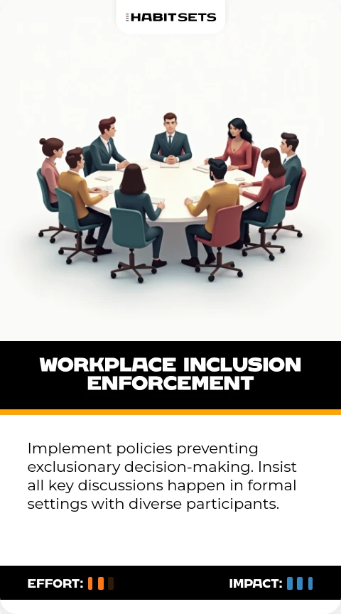 Implement policies preventing exclusionary decision-making. Insist all key discussions happen in formal settings with diverse participants.