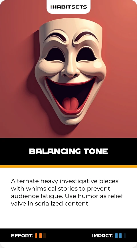 Alternate heavy investigative pieces with whimsical stories to prevent audience fatigue. Use humor as relief valve in serialized content.