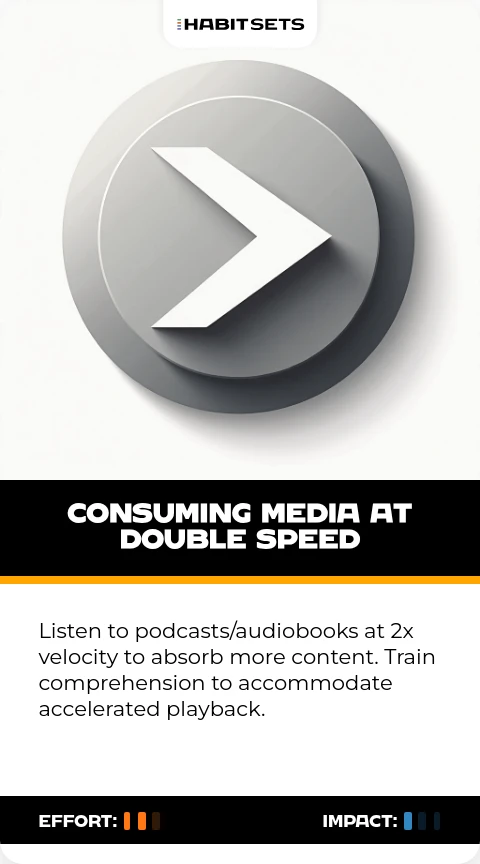 Listen to podcasts/audiobooks at 2x velocity to absorb more content. Train comprehension to accommodate accelerated playback.