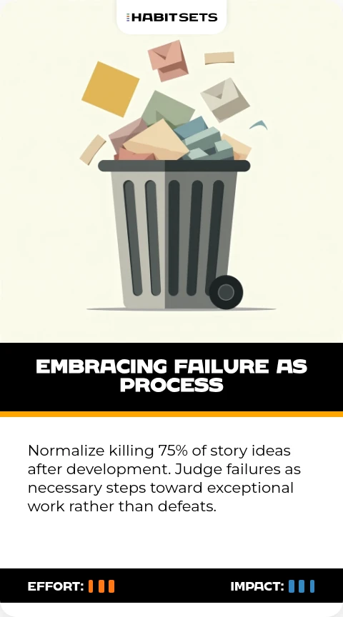 Normalize killing 75% of story ideas after development. Judge failures as necessary steps toward exceptional work rather than defeats.
