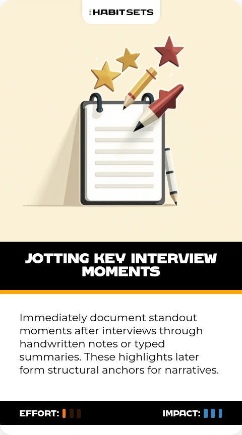 Immediately document standout moments after interviews through handwritten notes or typed summaries. These highlights later form structural anchors for narratives.