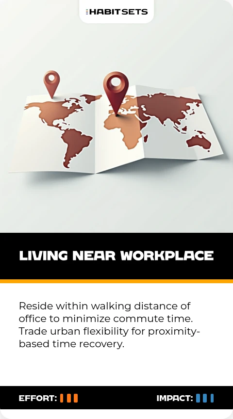 Reside within walking distance of office to minimize commute time. Trade urban flexibility for proximity-based time recovery.