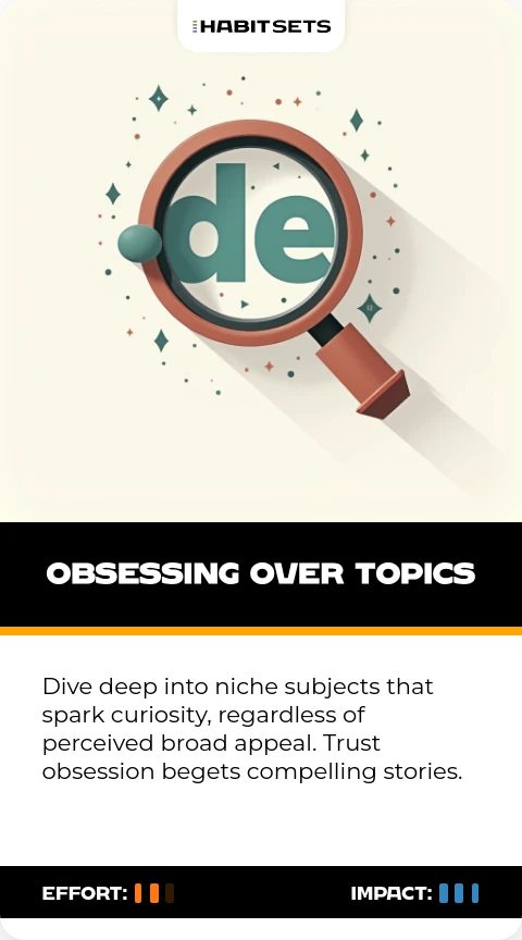 Dive deep into niche subjects that spark curiosity, regardless of perceived broad appeal. Trust obsession begets compelling stories.