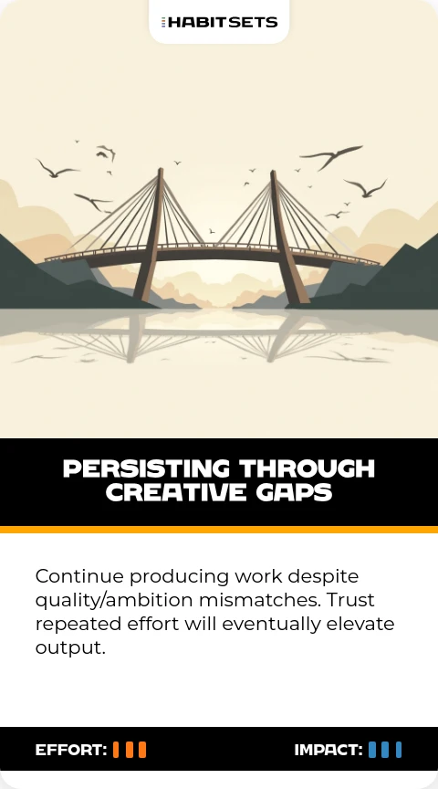 Continue producing work despite quality/ambition mismatches. Trust repeated effort will eventually elevate output.