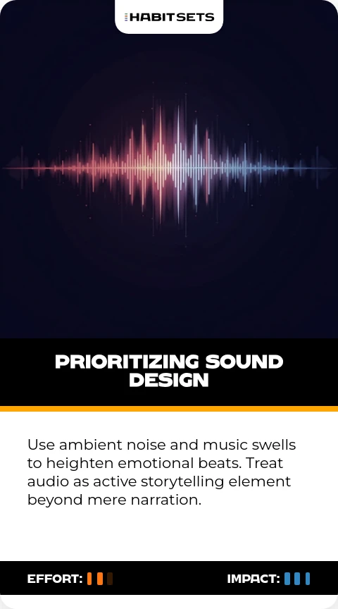 Use ambient noise and music swells to heighten emotional beats. Treat audio as active storytelling element beyond mere narration.