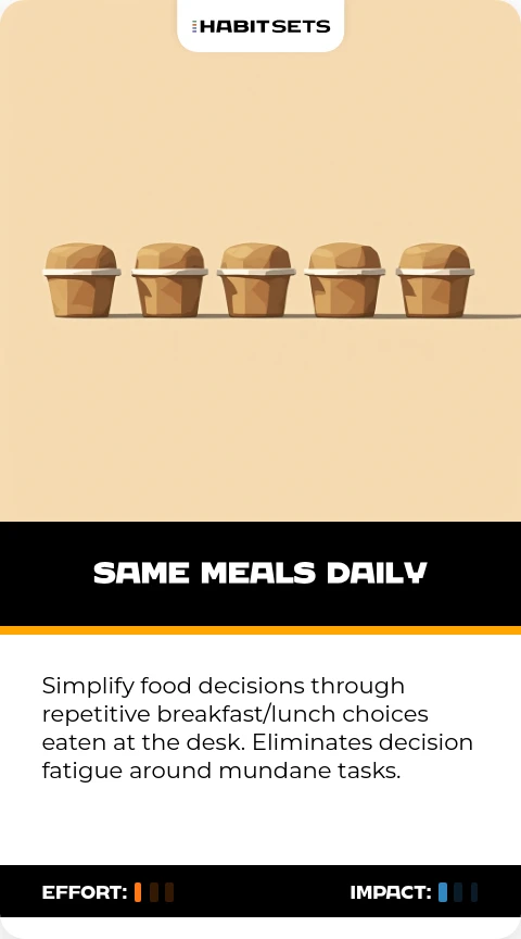 Simplify food decisions through repetitive breakfast/lunch choices eaten at the desk. Eliminates decision fatigue around mundane tasks.