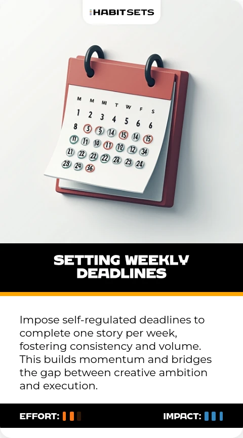 Impose self-regulated deadlines to complete one story per week, fostering consistency and volume. This builds momentum and bridges the gap between creative ambition and execution.