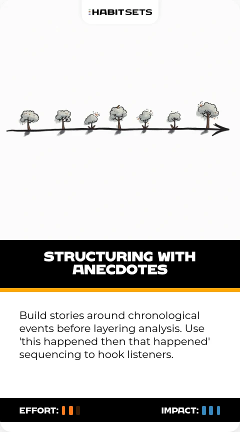 Build stories around chronological events before layering analysis. Use 'this happened then that happened' sequencing to hook listeners.