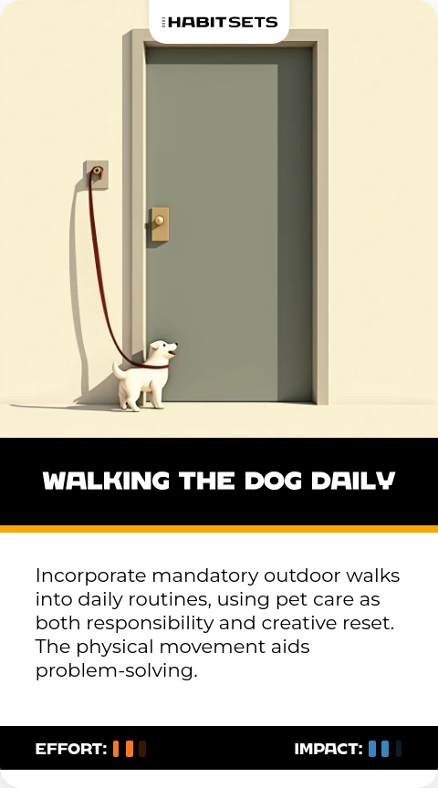 Incorporate mandatory outdoor walks into daily routines, using pet care as both responsibility and creative reset. The physical movement aids problem-solving.