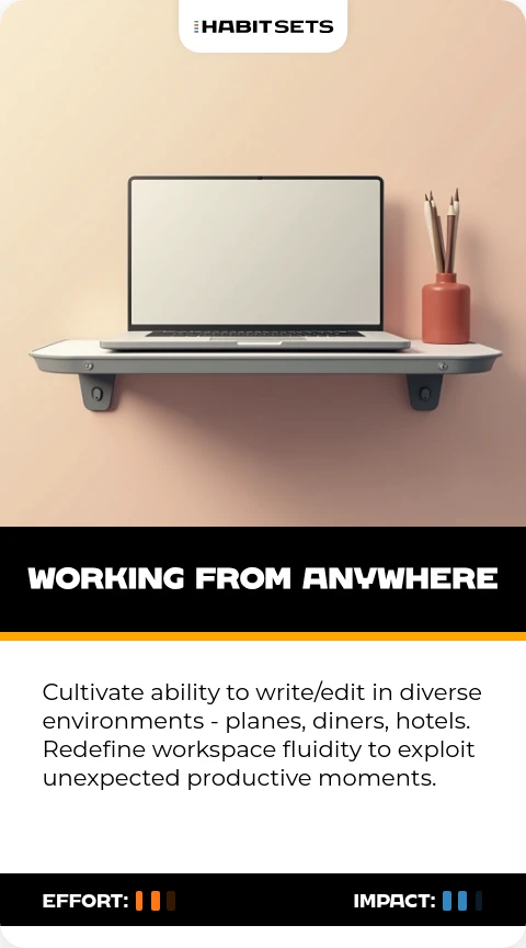 Cultivate ability to write/edit in diverse environments - planes, diners, hotels. Redefine workspace fluidity to exploit unexpected productive moments.