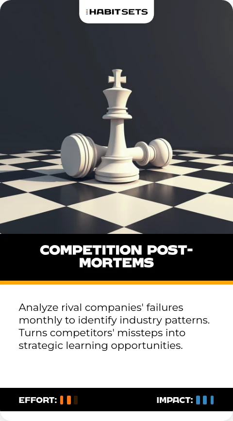 Analyze rival companies' failures monthly to identify industry patterns. Turns competitors' missteps into strategic learning opportunities.