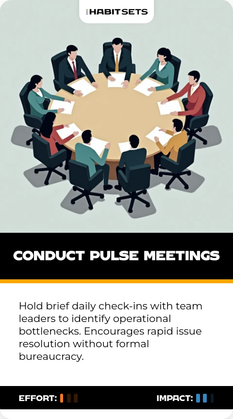 Hold brief daily check-ins with team leaders to identify operational bottlenecks. Encourages rapid issue resolution without formal bureaucracy.