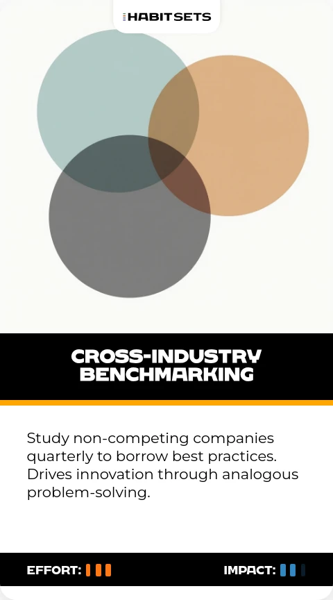 Study non-competing companies quarterly to borrow best practices. Drives innovation through analogous problem-solving.