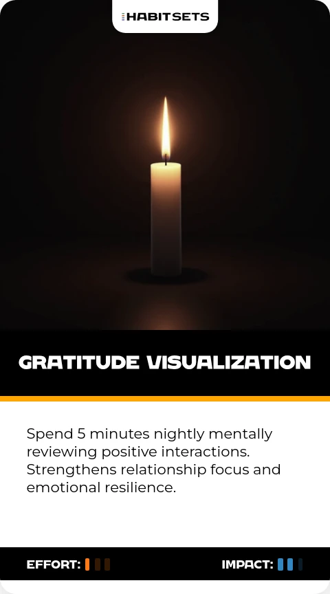 Spend 5 minutes nightly mentally reviewing positive interactions. Strengthens relationship focus and emotional resilience.