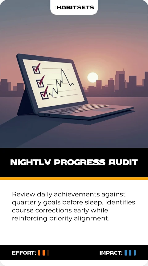 Review daily achievements against quarterly goals before sleep. Identifies course corrections early while reinforcing priority alignment.