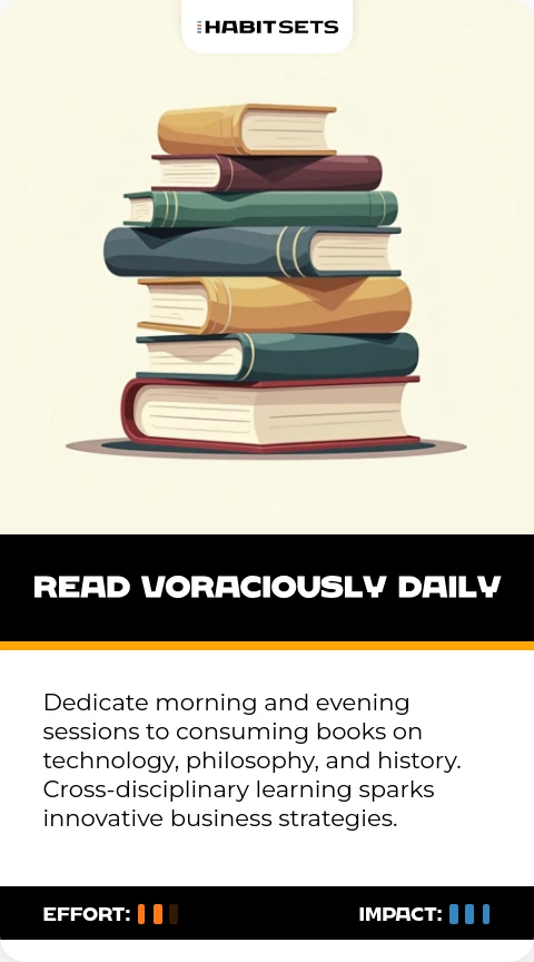 Dedicate morning and evening sessions to consuming books on technology, philosophy, and history. Cross-disciplinary learning sparks innovative business strategies.