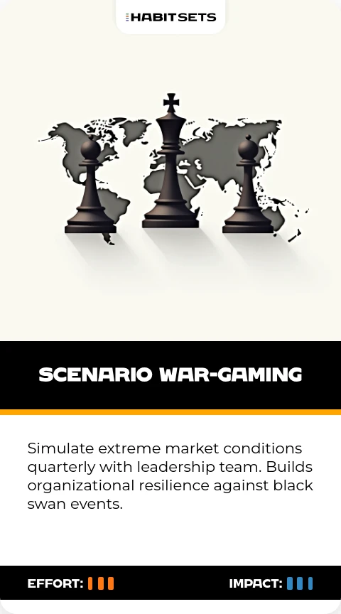 Simulate extreme market conditions quarterly with leadership team. Builds organizational resilience against black swan events.
