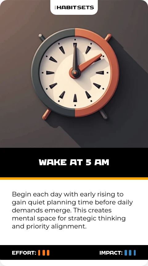 Begin each day with early rising to gain quiet planning time before daily demands emerge. This creates mental space for strategic thinking and priority alignment.