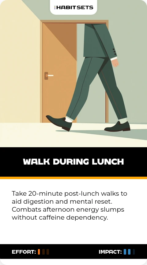 Take 20-minute post-lunch walks to aid digestion and mental reset. Combats afternoon energy slumps without caffeine dependency.