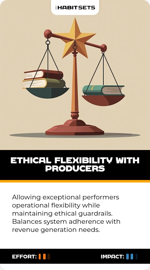 Allowing exceptional performers operational flexibility while maintaining ethical guardrails. Balances system adherence with revenue generation needs.